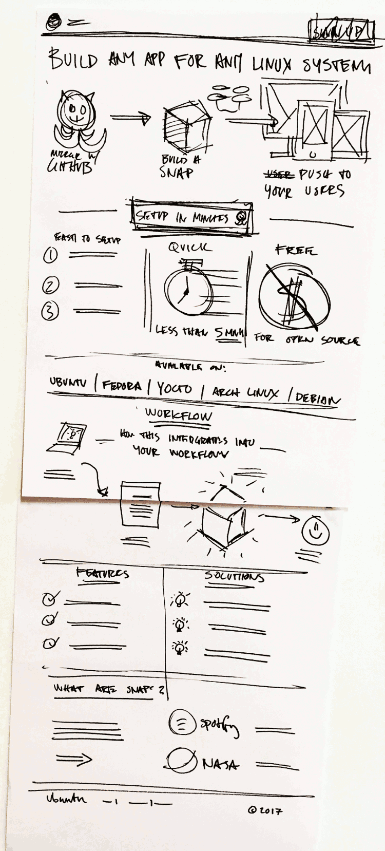 The design patterns in Canonical’s Vanilla CSS framework, for basic components like headings and buttons, made it possible for engineers to lay out pages based directly on the wireframes and functional spec with little need for visual design. But in a few cases, visual designers produced mockups where we had good reason to diverge from existing patterns. And the front page in particular benefited from illustrations by graphics whiz Matthieu James.